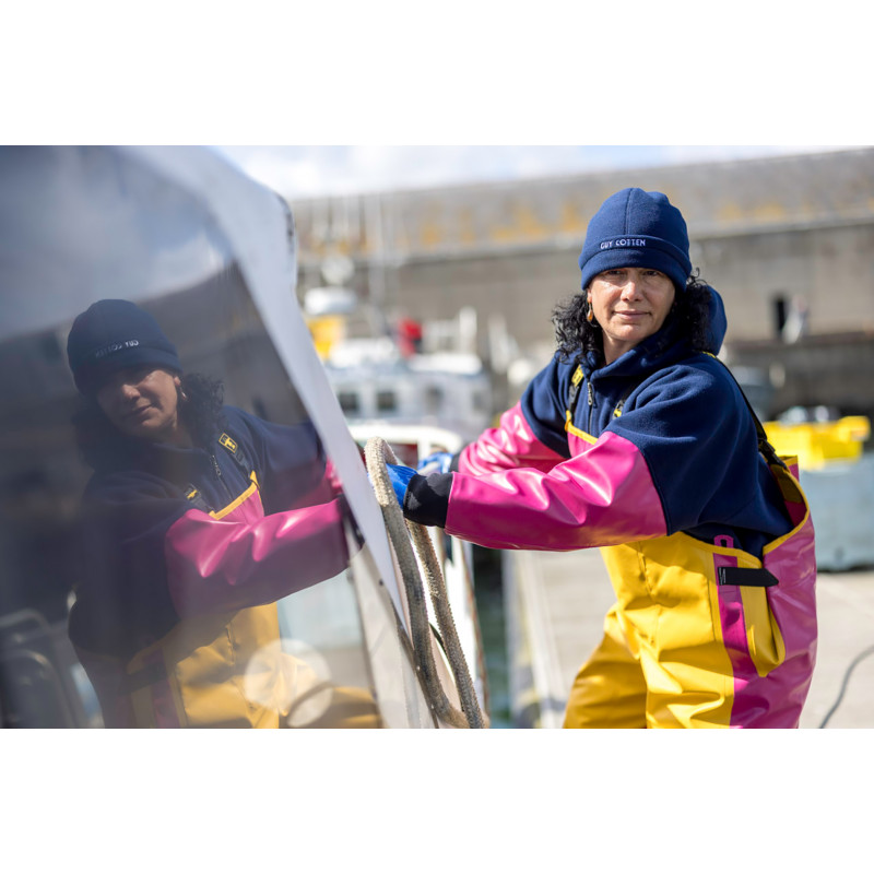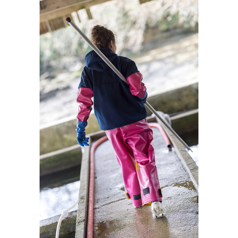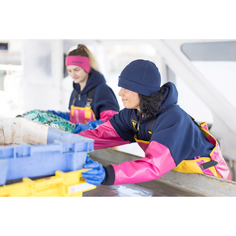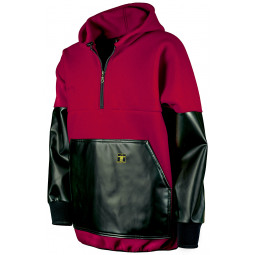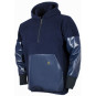 Combination of warmth and protection of front and sleeves. Pullover in POL350 fleece. Sleeves and large front pocket in PVC coated fabric. Hood with drawcords. Short front zip fastening.