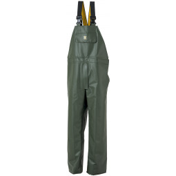 Waterproof Bib and Braces. Adjustable snap fastening over gusset on one side of bib. Adjustable elasticated braces on front and back, removable by means of plastic clip buckles + braces divider. Knee reinforcements can be inserted inside.
