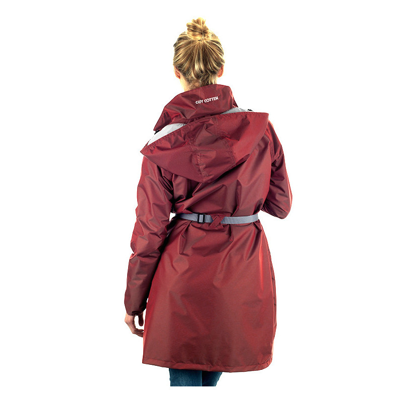 Snap fasteners Collar and large detachable hood. Yachting-style strap belt for easy fastening. Crossed loops.