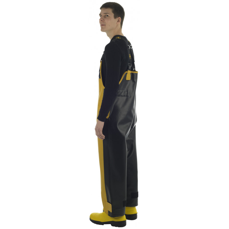 High bib and braces with ample space in front and at back. Made of Nylpeche fabric on the front for intensive uses.